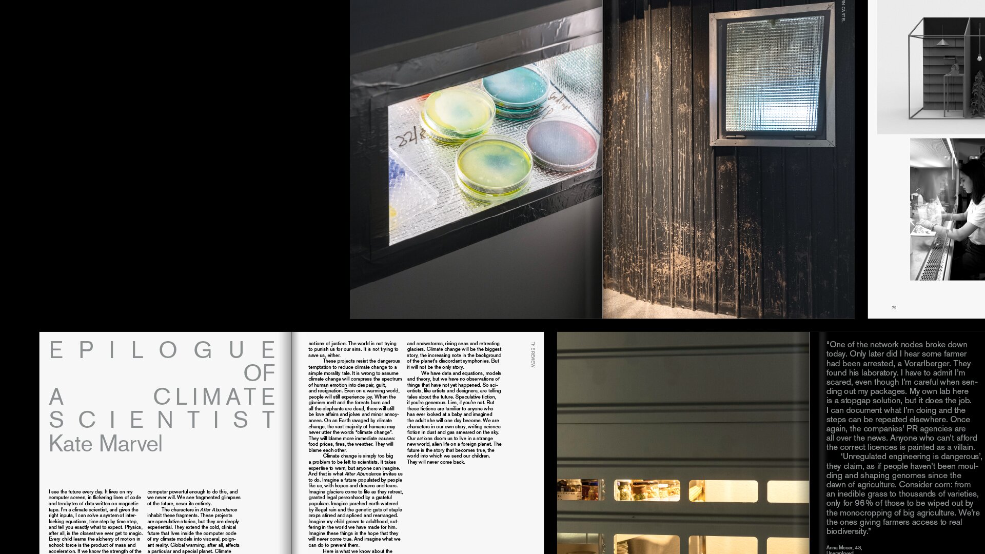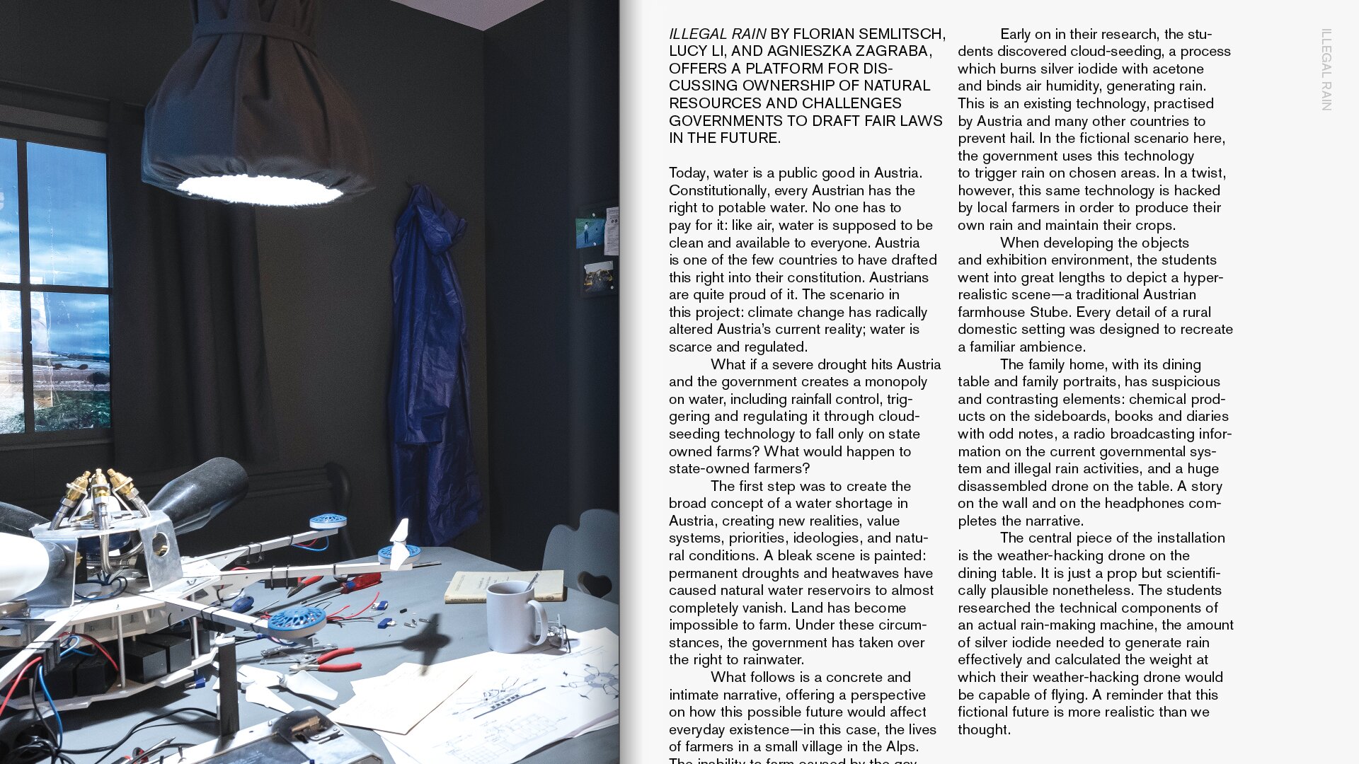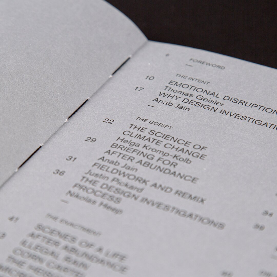 Das Werk zeigt den Leser:innen wie mit Experimenten, rechtlichen Kunstgriffen, Protesten und Performances, das Leben von Menschen einer möglichen Zukunft aussehen könnte. Mit der Auseinandersetzung von lokalen Traditionen und Technologie, handwerklichem Geschick und Einfallsreichtum zeigen die Studierenden von Studio Design Investigations (Universität für angewandte Kunst Wien, unter der Leitung von Anab Jain) wie sich lokale Gemeinschaften mit neuen Herausforderungen und veränderten Umgbungen weiterhin entfalten können.