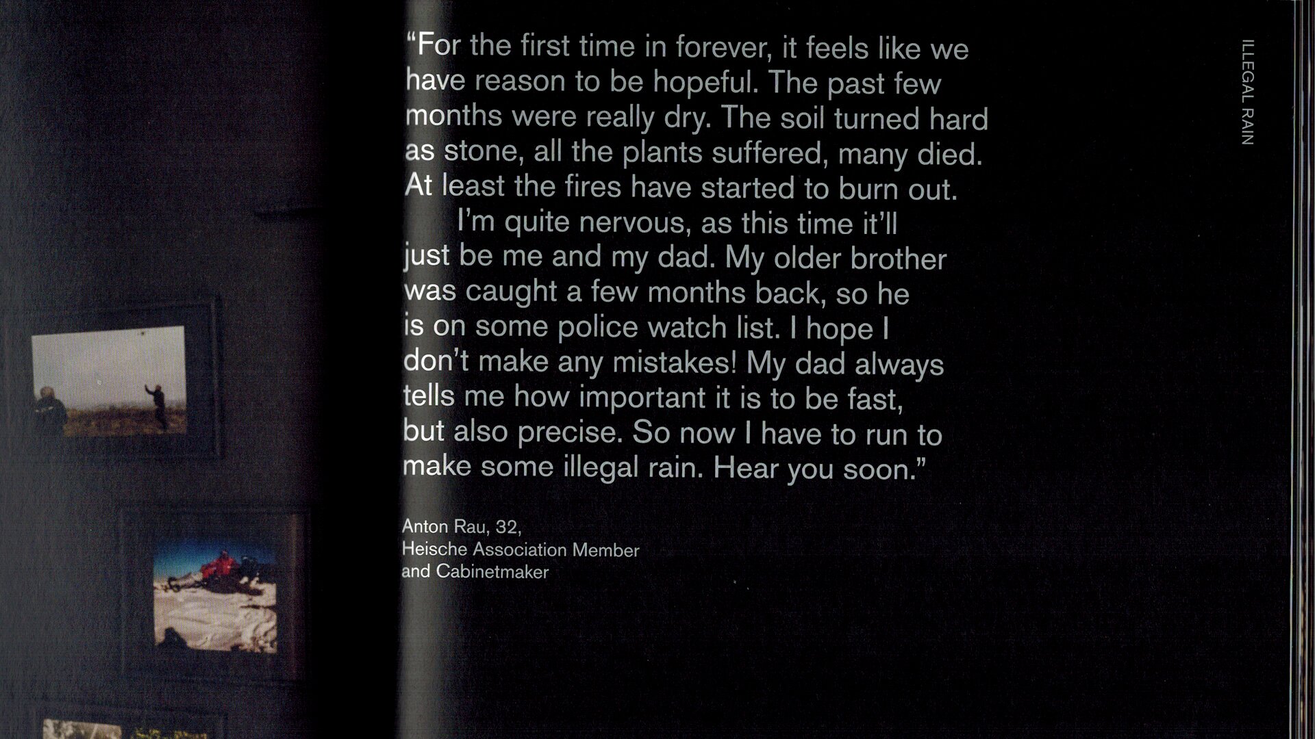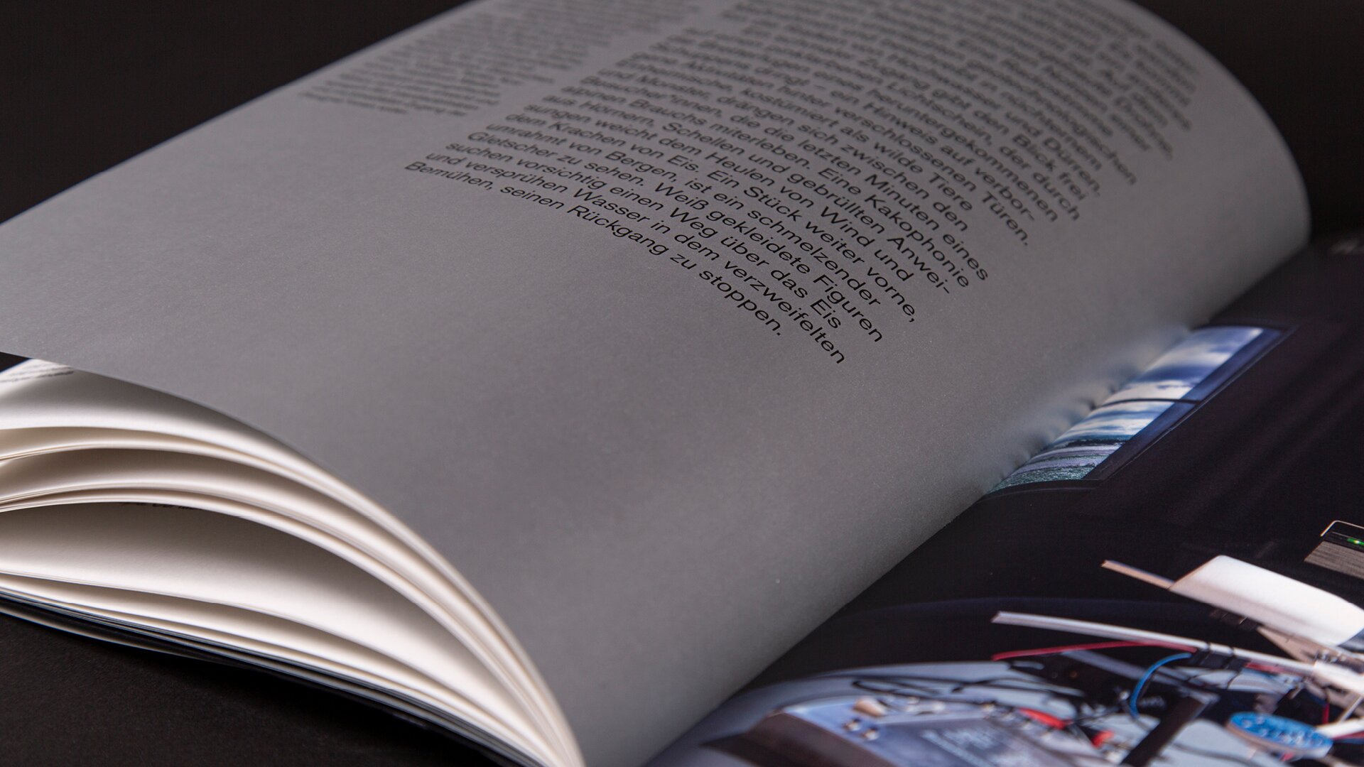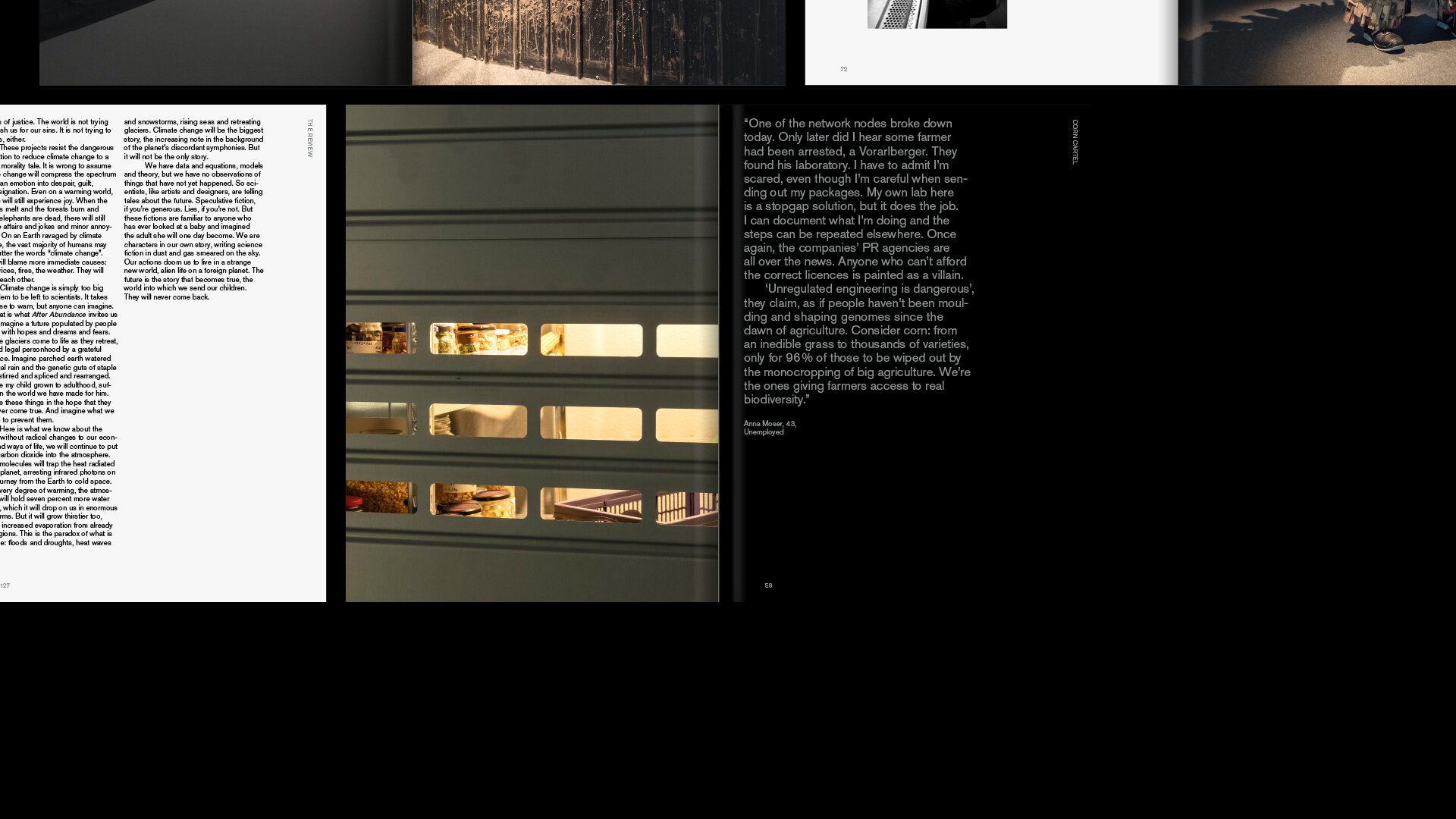 Die grafische Gestaltung der Publikation folgt der kühlen Realität der Zukunft und nimmt sich einzelner archaischer Referenzen in Material und Farbe an, die Typografie folgt ihren eigenen Regeln. Dennoch schafft sie es, Ordnung, Übersicht und Struktur zu geben.