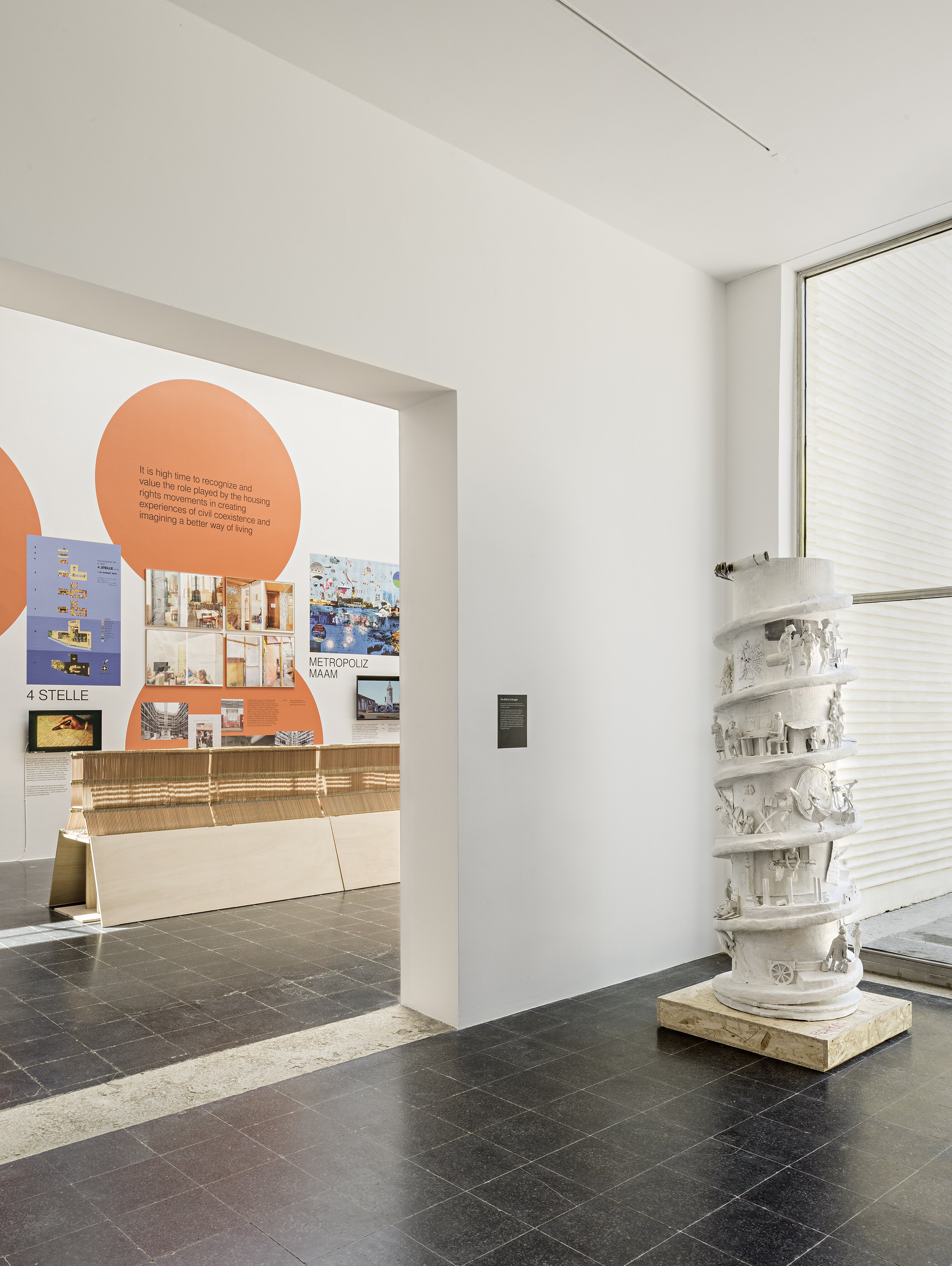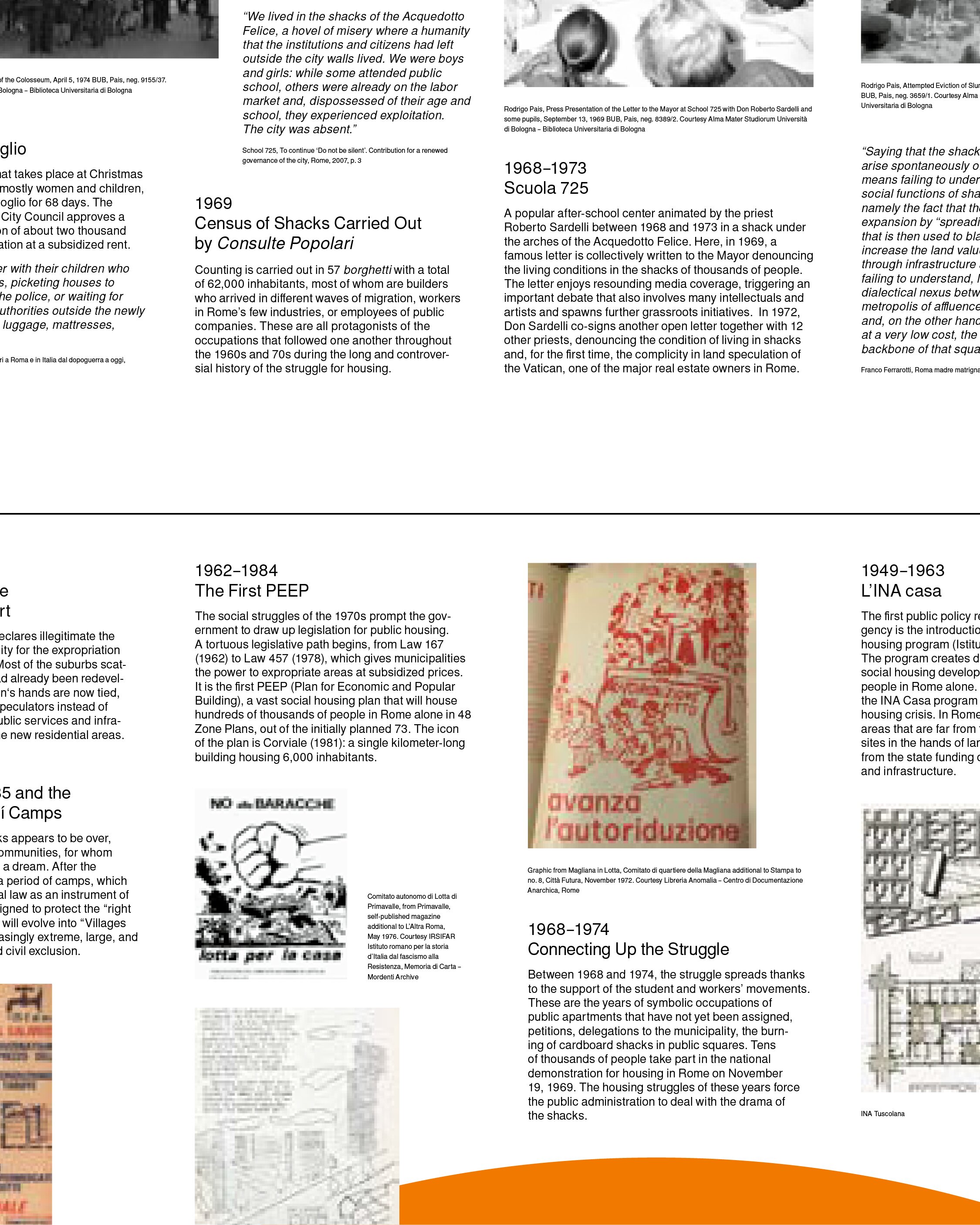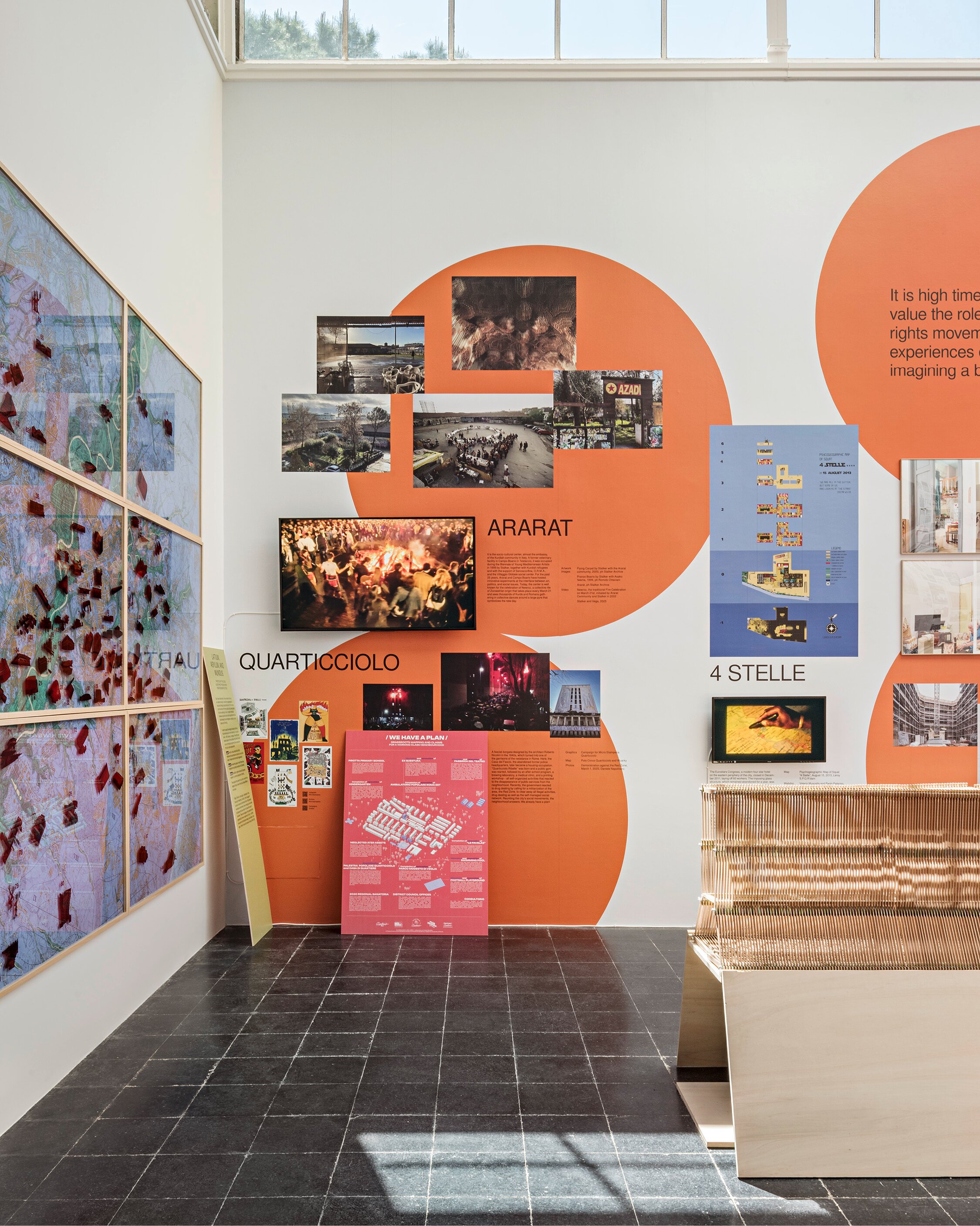 ROM ist das Gegenmodell: dicht, spontan, chaotisch, intensiv – Symbol unkontrollierter Stadtentwicklung, aber auch voller Initiativen, die sich aus der Notwendigkeit heraus selbst organisieren. Für diesen Teil der Ausstellung haben wir ein großmaßstäbliches, dichteres Gestaltungskonzept entwickelt, das keinem Raster folgt, aber dennoch mit punktuellen Bezügen arbeitet und Highlights setzt – Bottom-up – der Ansatz, der unterschiedliche Realitäten der ewigen Stadt erfahrbar macht.