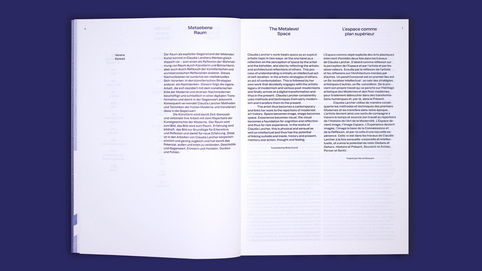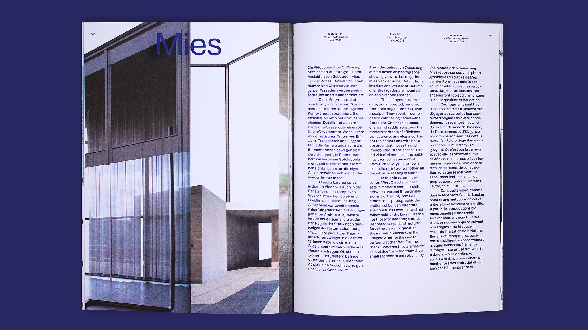 Claudia Larchers Fotografien, Collagen, Videoanimationen, (textile) Objekte und Installationen machen räumliche Grenzen elastisch; Raumkontinuen finden sich ins Unendliche gestreckt oder auf einen Nullpunkt komprimiert, ineinander verschoben oder neu gesampelt. In einem Akt der Aneignung werden Architektur-, Landschafts-, Natur-, aber auch Hautbilder wie Found-Footage-Material herangezogen, um die Oberflächen und Strukturen des Realen neu zu denken.