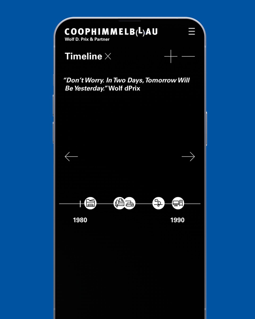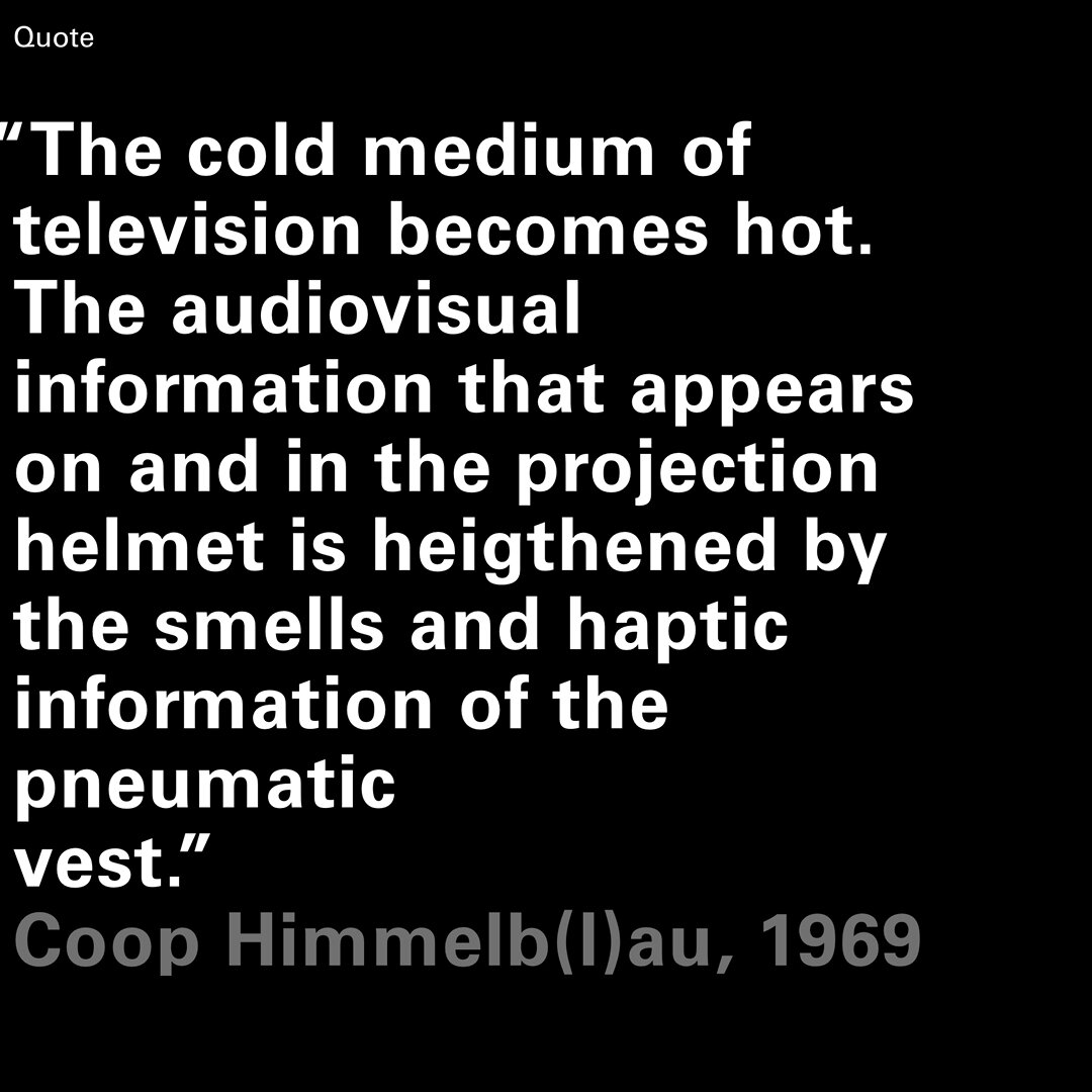 „Coop Himmelb(l)au ist keine Farbe, sondern die Idee Architektur mit Phantasie leicht und veränderbar wie Wolken zu machen.“ Dieses Credo bestimmte das Werk der Gruppe. Architektur solle leicht und veränderbar, wie Wolken, sein. Also flexibel, mobil, flüchtig, organisch. Ende der 1970er Jahre veränderte sich das Motto und der Fokus auf den totalen Raum: „Wir haben keine Lust, Biedermeier zu bauen. Nicht jetzt und zu keiner anderen Zeit. Wir haben es satt Palladio und andere historische Masken zu sehen, weil wir in der Architektur nicht all das ausschließen wollen, was unruhig macht. Wir wollen Architektur, die mehr hat. Wir wollen Architektur, die leuchtet, die sticht, die fetzt und unter Dehnung reißt. Architektur muss schluchtig, feurig, glatt, hart, brutal, rund, zärtlich, farbig, obszön, geil, träumend, vernähend, verfehrnend, naß, trocken und herzschlagend sein. Lebend oder tot. Wenn sie kalt ist, dann kalt wie ein Eisblock. Wenn sie heiß ist, dann so heiß wie ein Flammenflügel. Architektur muss brennen.“