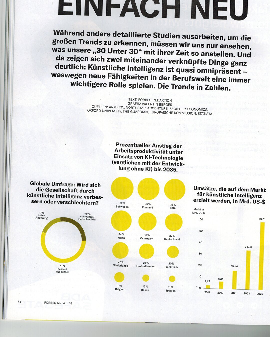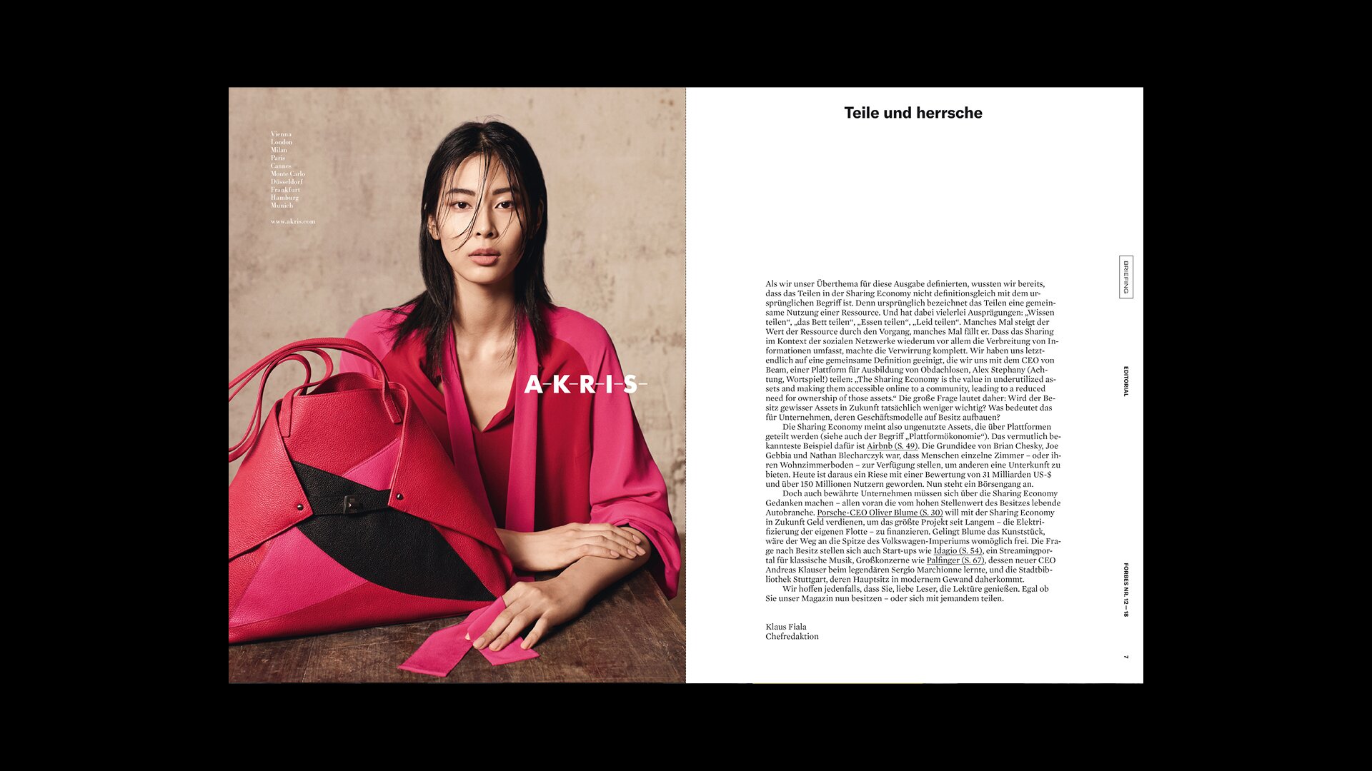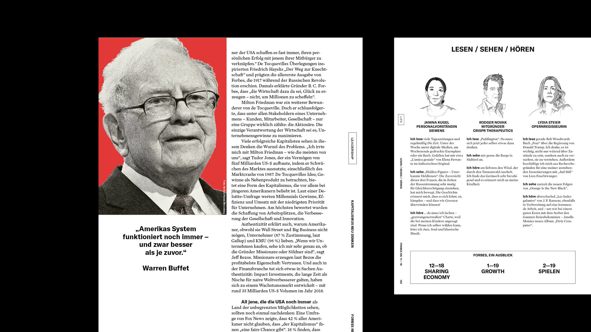 Das Design der deutschsprachigen Ausgabe von Forbes ist entsprechend kompromisslos, klar und zeitgemäß gestaltet. Als Art Director hat Christof Nardin eine Dramaturgie für das Magazin entwickelt, die auf dem inhaltlichen Kern basiert. Er stattete die Redaktion mit einer umfassenden Toolbox und Modulen aus.