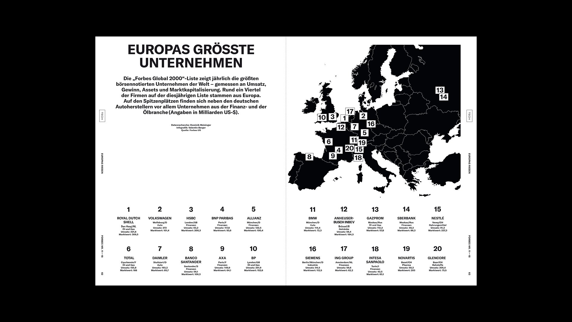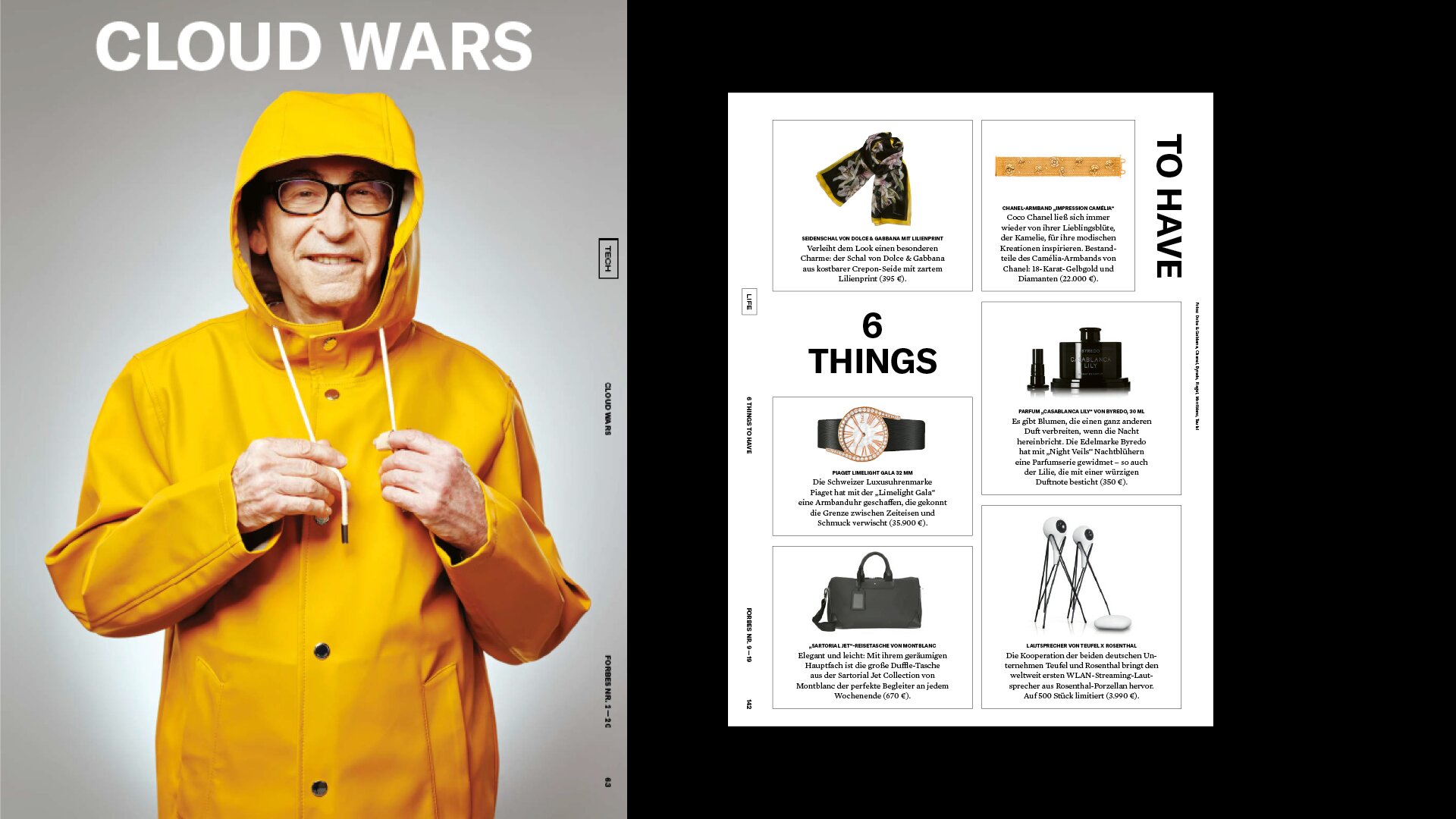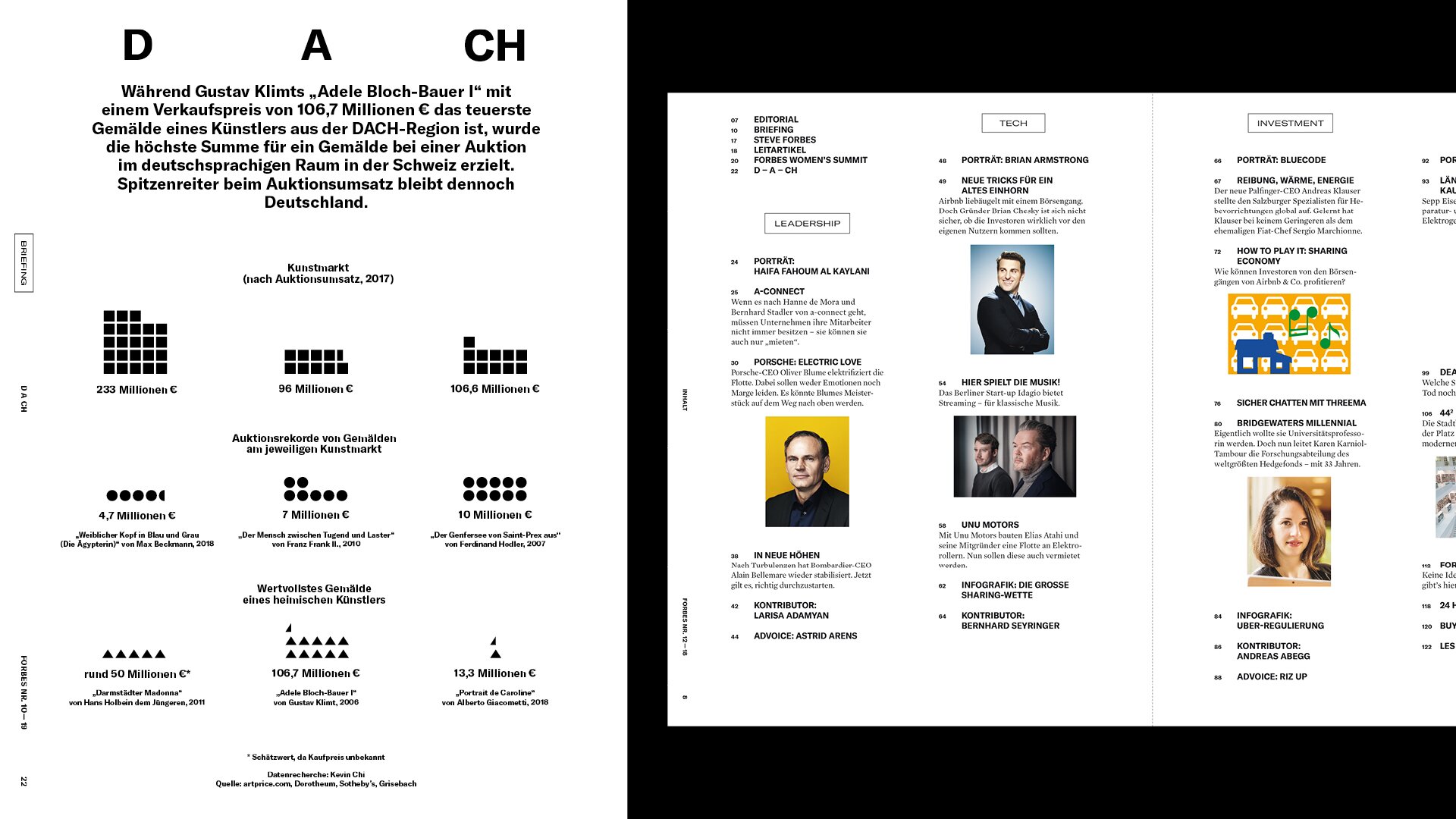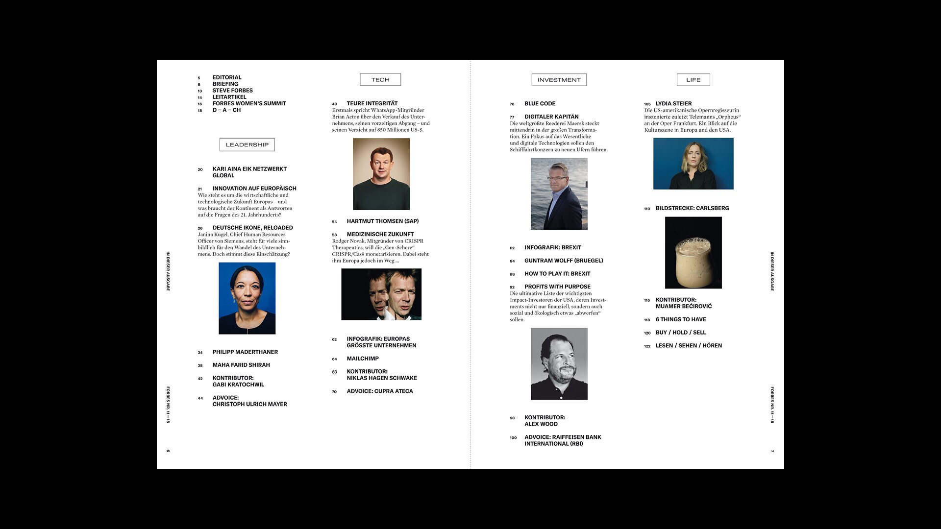 Das streng serielle Cover-Design stellt Persönlichkeiten in den Mittelpunkt und der Inhalt folgt den vier Kategorien LEADERSHIP, TECH, INVEST und LIFE. Unterschiedliche Inhaltstypen fungieren als Gerüst und können modular angeordnet und angepasst werden, um der Redaktion den Fokus auf die Produktion von Geschichten und ihre Erzählung zu ermöglichen.