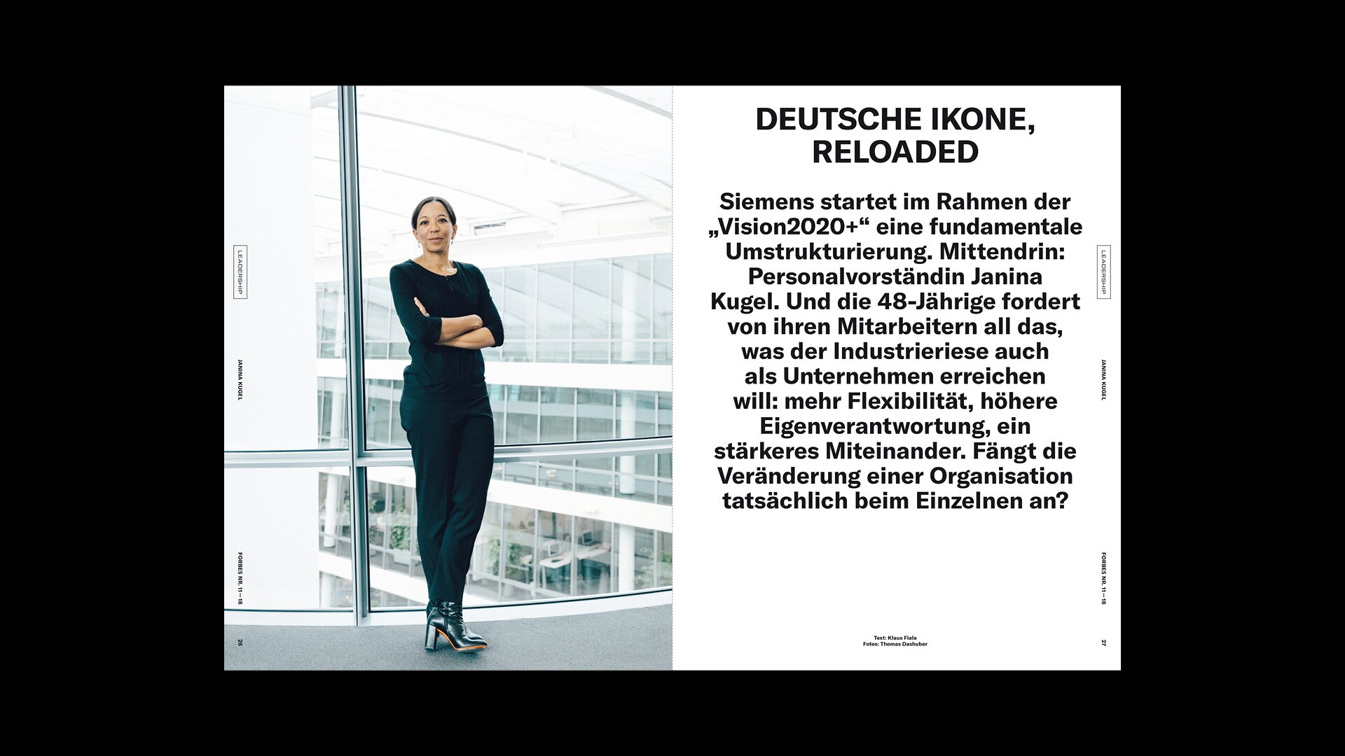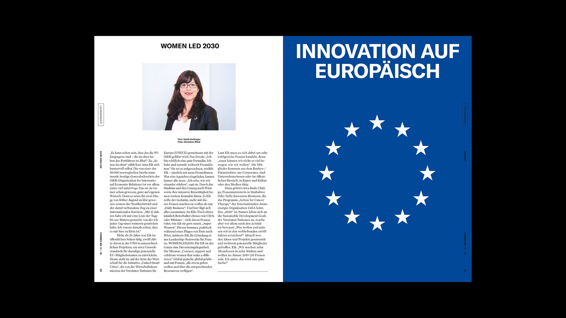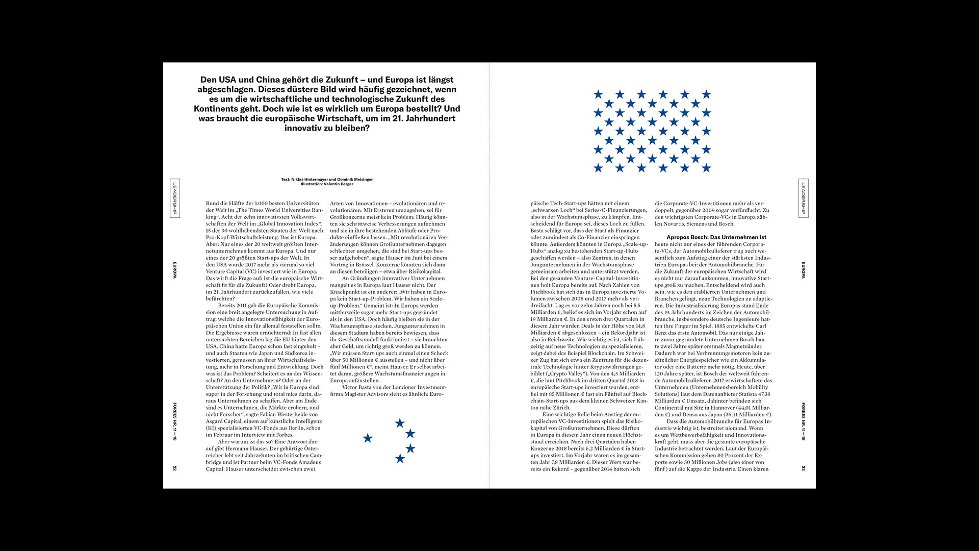 Das streng serielle Cover-Design stellt Persönlichkeiten in den Mittelpunkt und der Inhalt folgt den vier Kategorien LEADERSHIP, TECH, INVEST und LIFE. Unterschiedliche Inhaltstypen fungieren als Gerüst und können modular angeordnet und angepasst werden, um der Redaktion den Fokus auf die Produktion von Geschichten und ihre Erzählung zu ermöglichen.