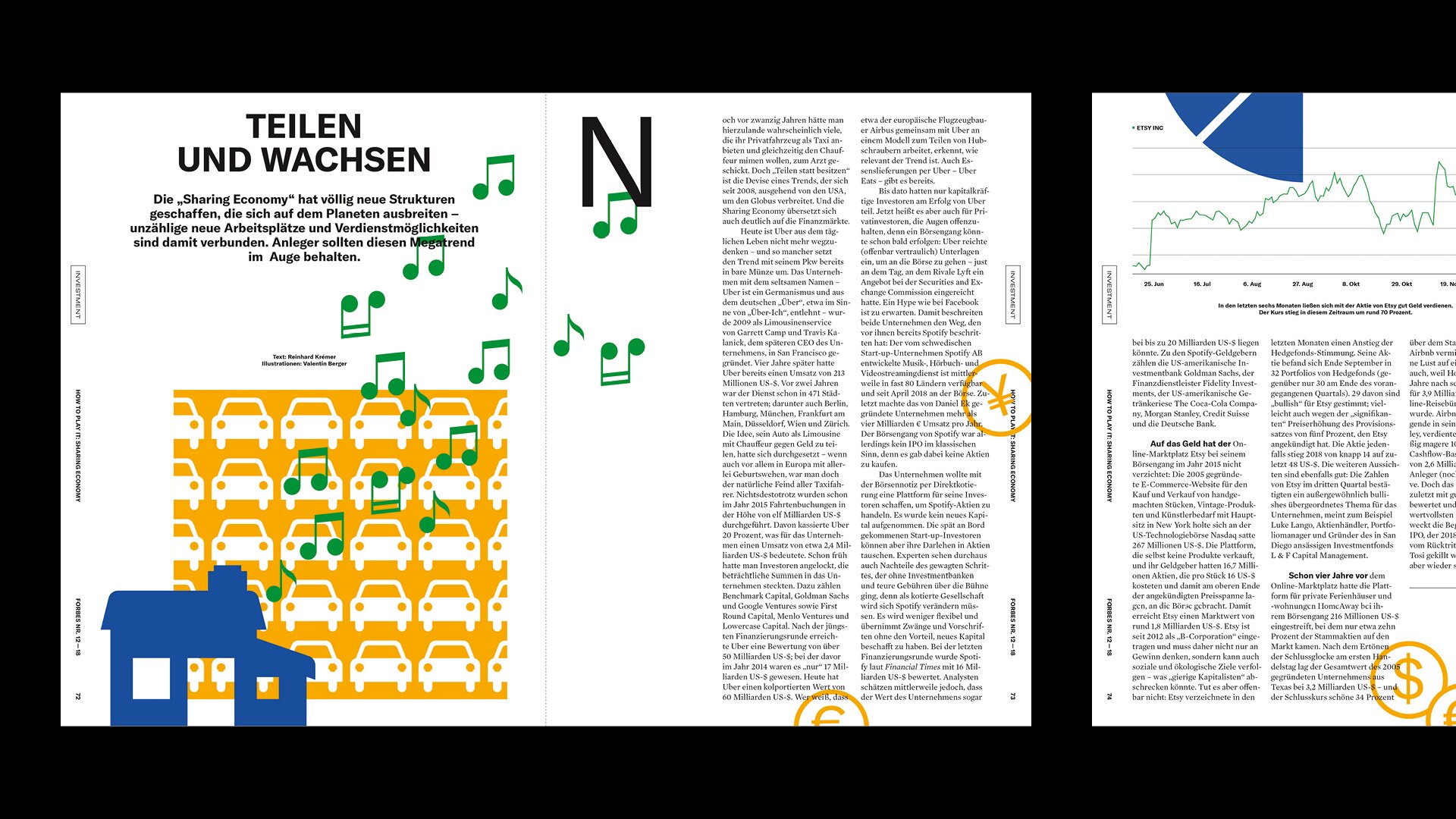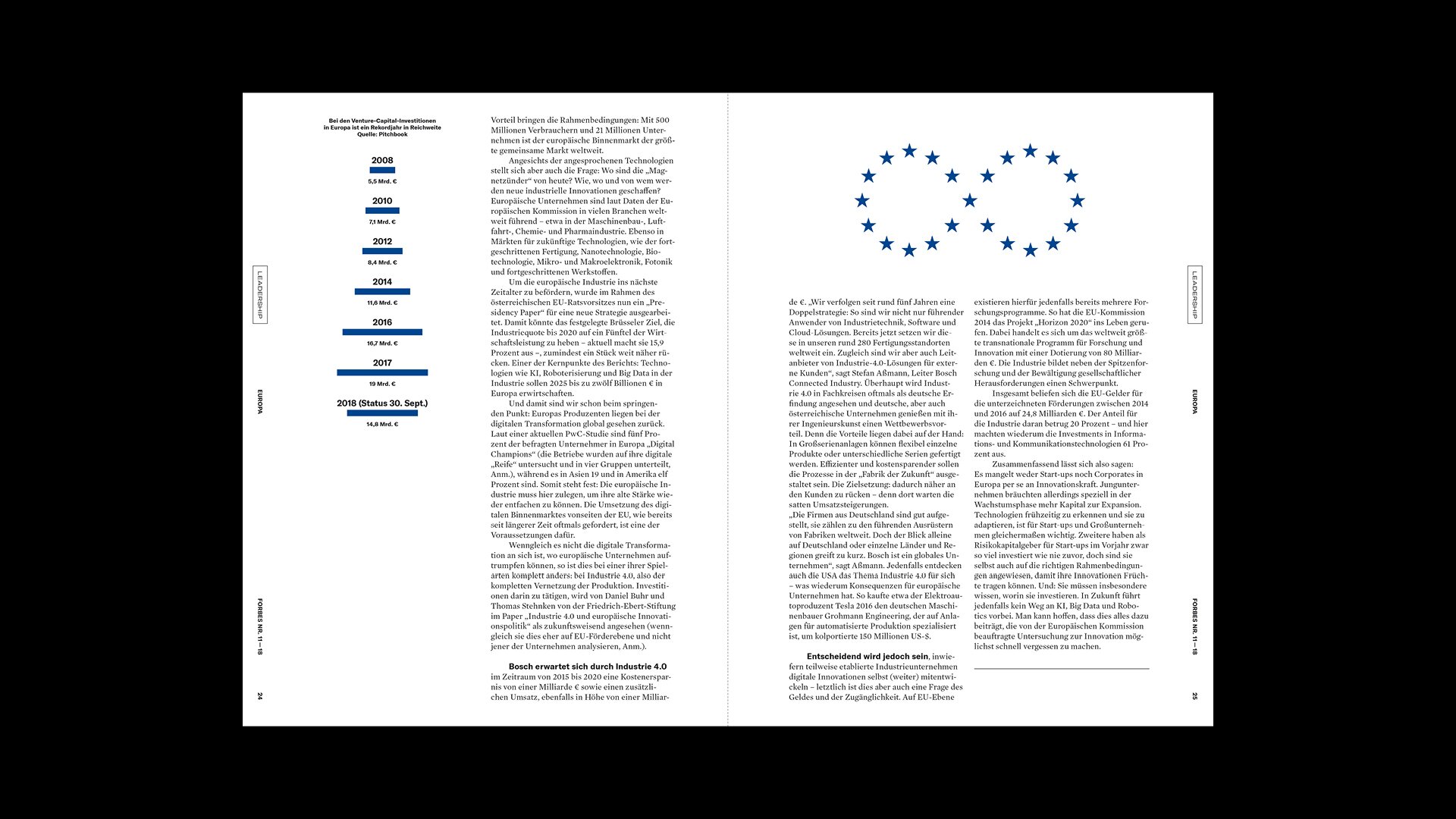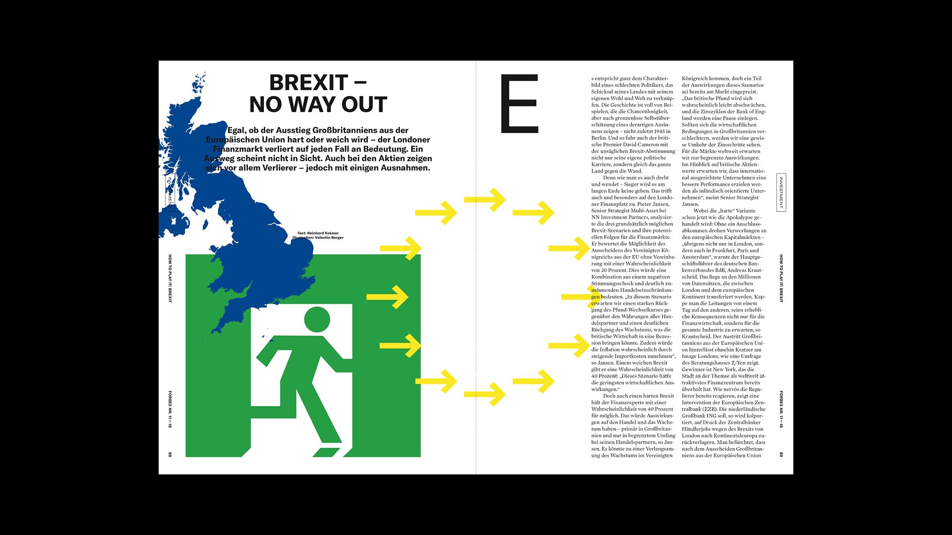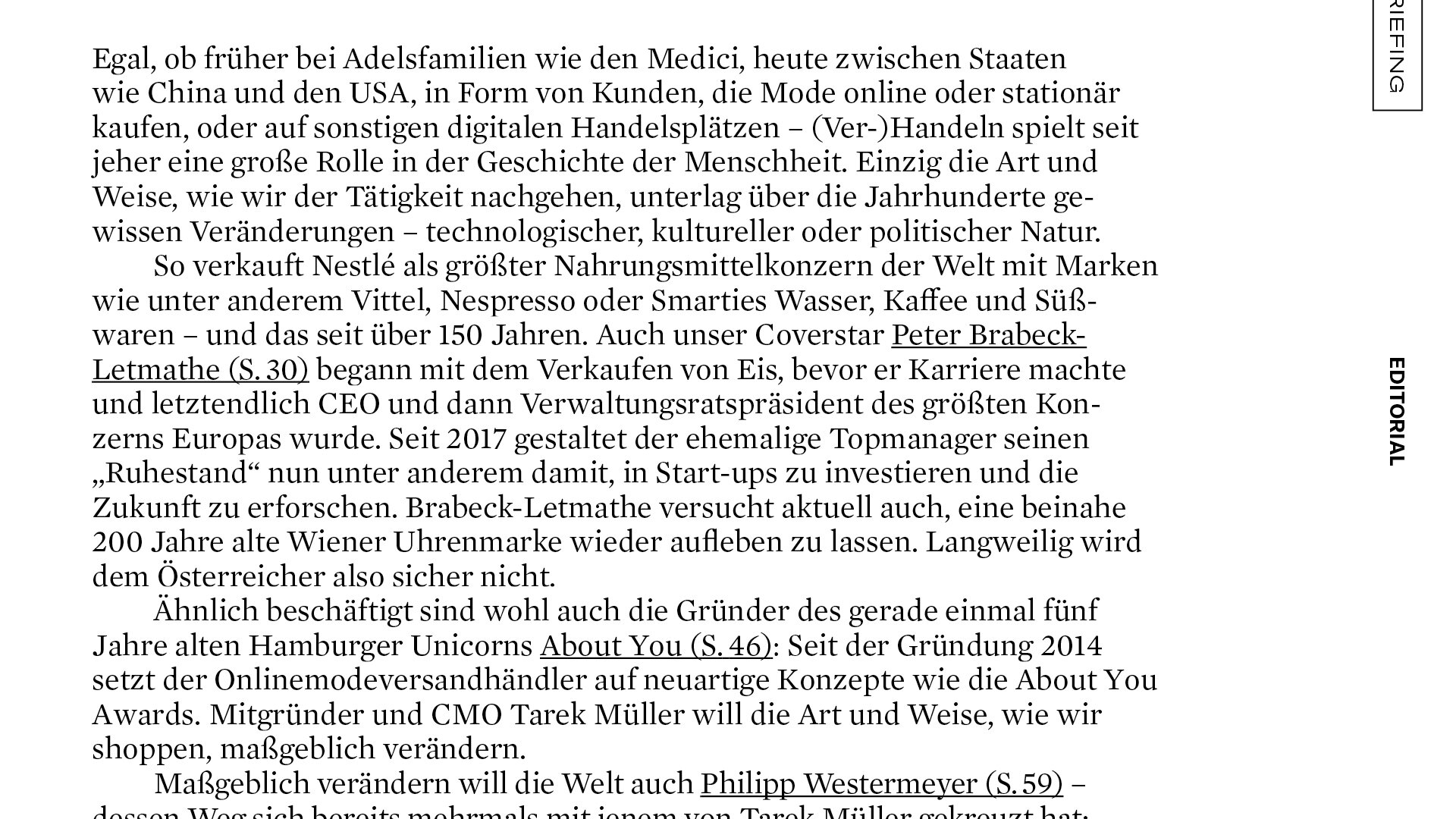 Das streng serielle Cover-Design stellt Persönlichkeiten in den Mittelpunkt und der Inhalt folgt den vier Kategorien LEADERSHIP, TECH, INVEST und LIFE. Unterschiedliche Inhaltstypen fungieren als Gerüst und können modular angeordnet und angepasst werden, um der Redaktion den Fokus auf die Produktion von Geschichten und ihre Erzählung zu ermöglichen.