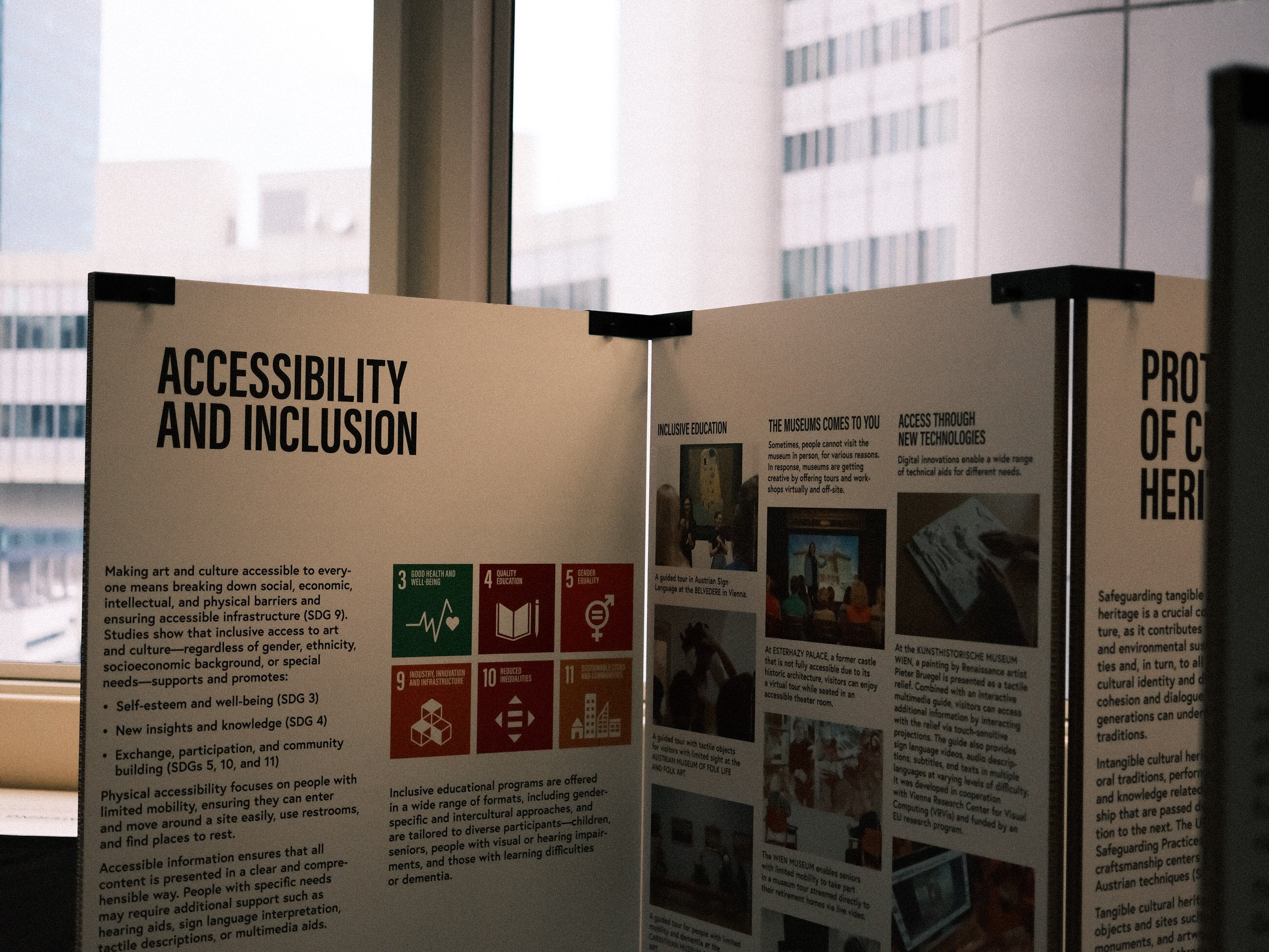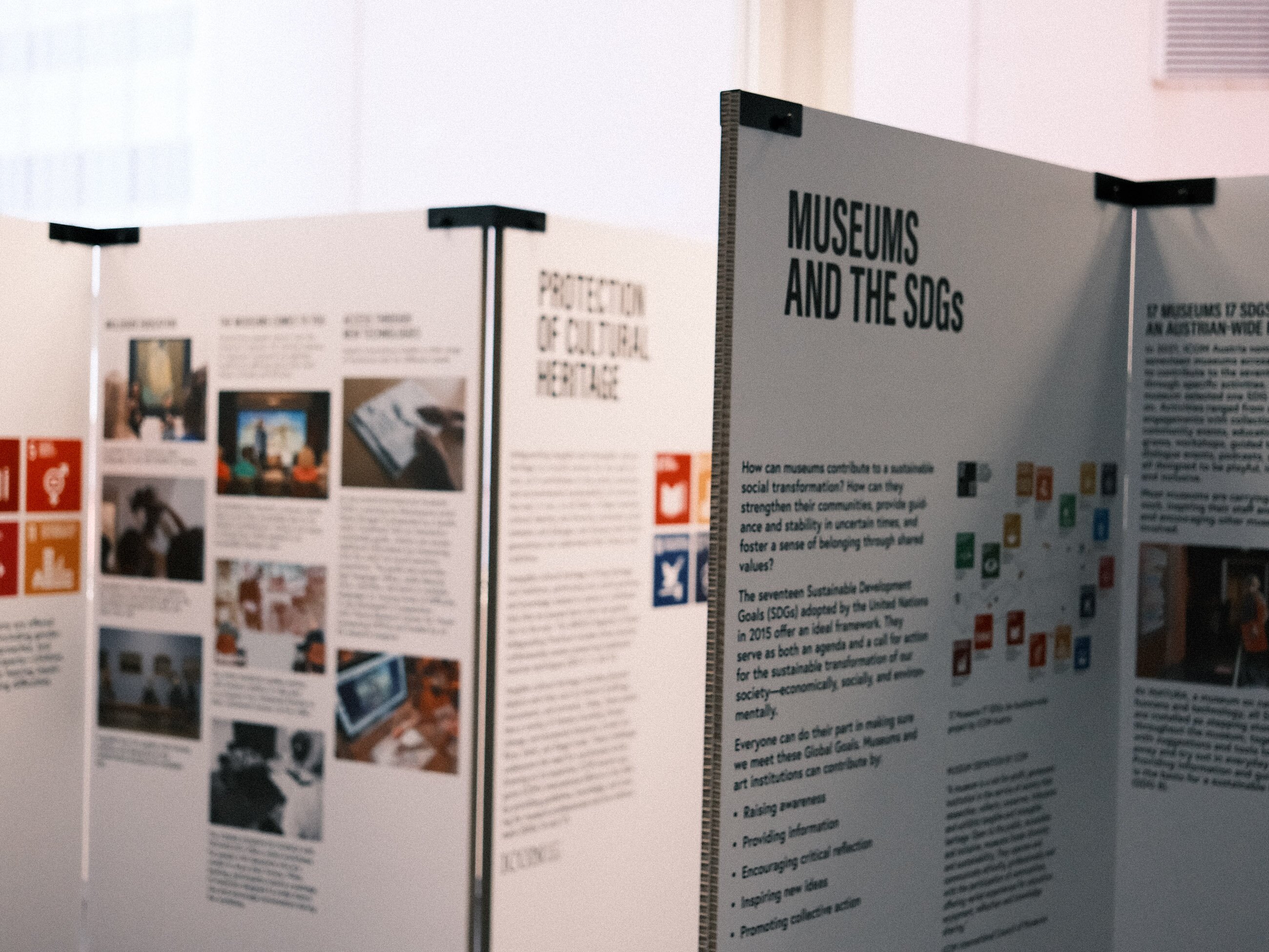 Die Ausstellung folgt sechs übergeordneten Themen, die jeweils mehrere der 17 Ziele vereinen. Diese Themen sind: Museums and the SDGs, Climate Change and Environmental Protection, Accessibility and Inclusion, Sustainable Design and Architecture, Protection of Cultural Heritage, Community Building and Participation sowie Cultural Diversity.