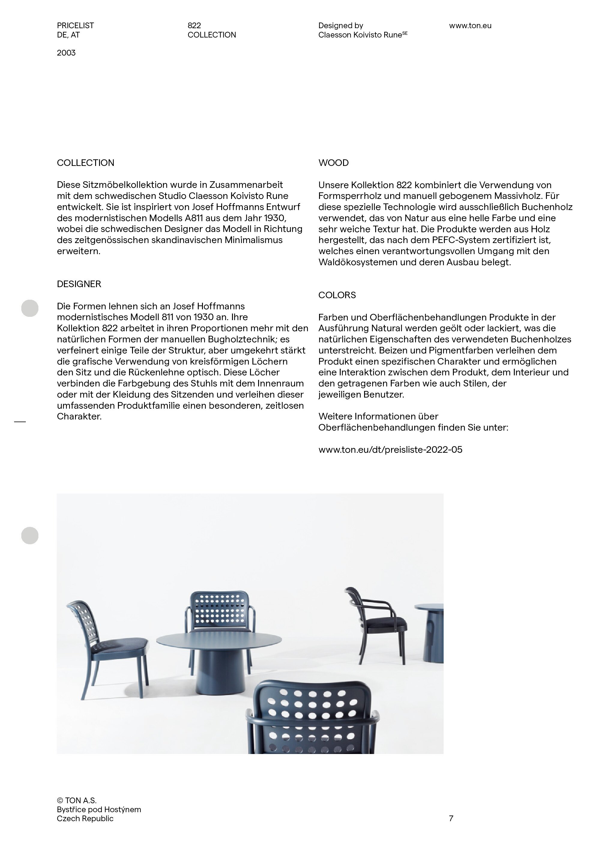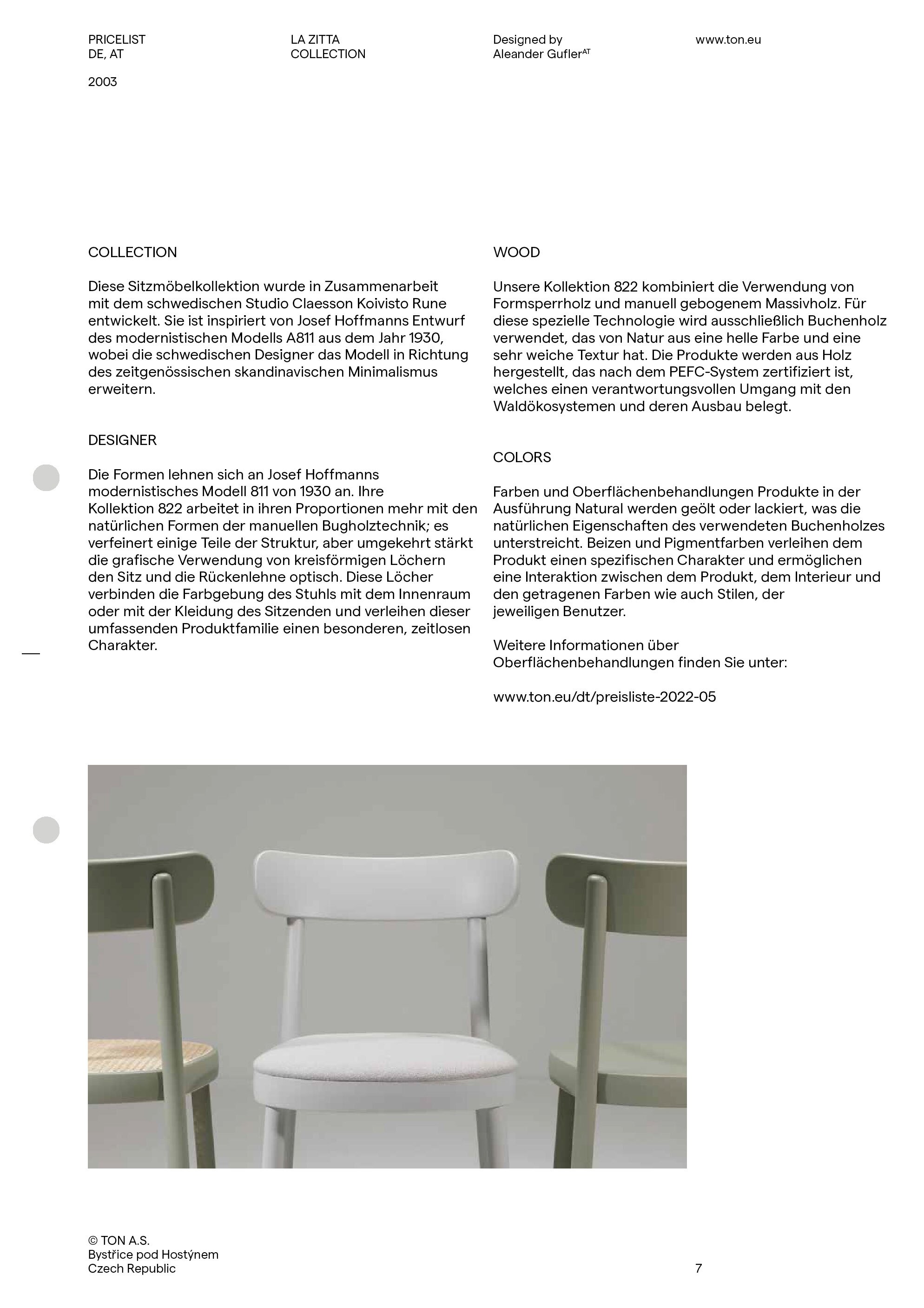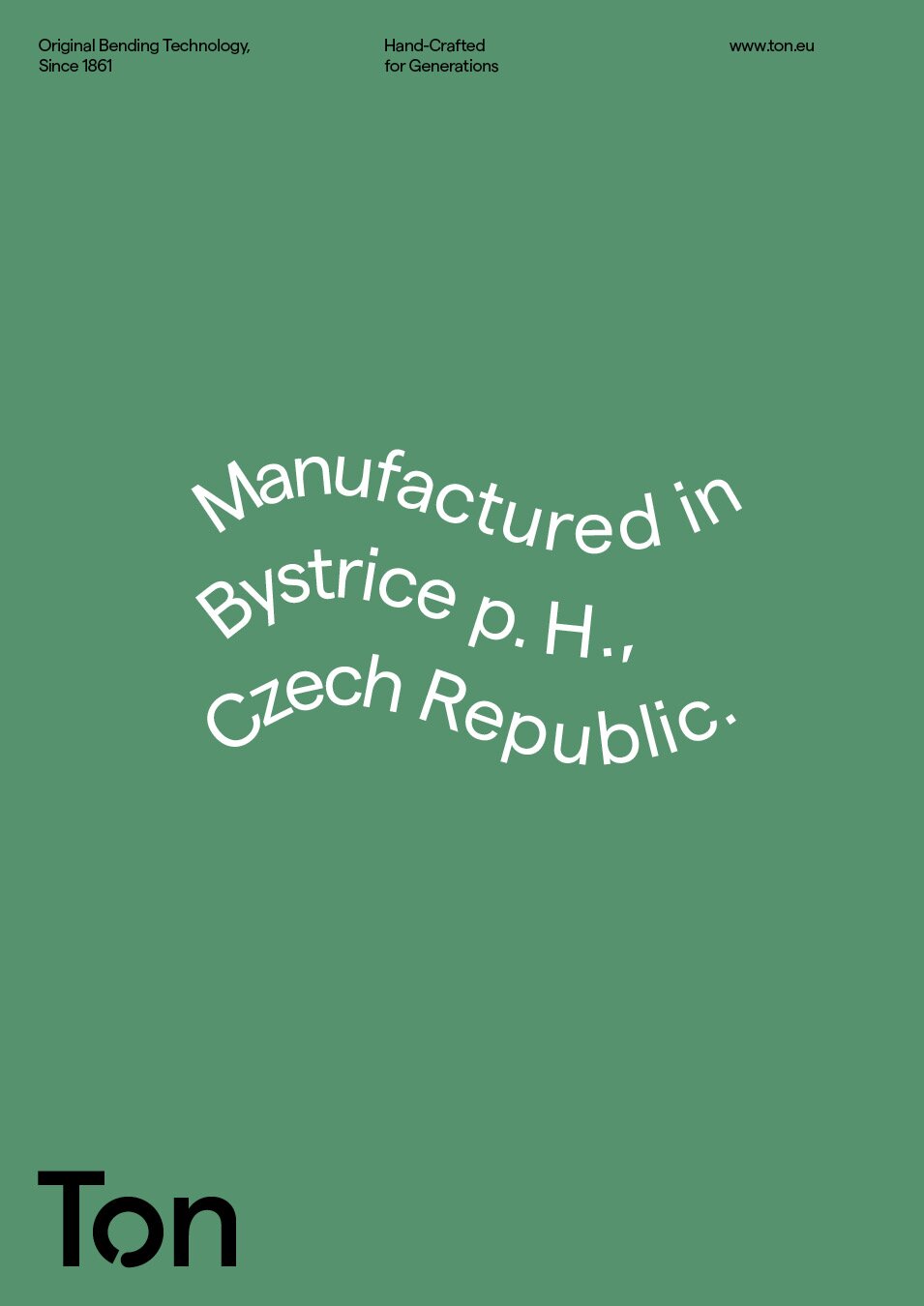 Dort wo Michael Thonet im Jahr 1861 seine erste Fabrik ausserhalb Wiens eröffnete, wird noch immer leidenschftlich Holz gebogen und zu Sesseln vearbeitet. Bystřice pod Hostýnem (Bistritz am Holstein, im heutigen Tschechien) ist der kleine Ort mitten in den Buchenwäldern, der den Fabrikanten auch mit dem Rohstoff in entsprechender Qualität versorgte, damit in den folgenden Jahrzehnten Millionen von Kaffeehaus- und Design-Klassikern in alle Welt exportiert werden konnten. Die Geschichte hat einige Wendungen genommen. Heute ist TON das Nachfolgeunternehmen und Marke. Neuste Technologie wird mit über 160 Jahre alter Tradition kombiniert. Das Sortiment ist ein Bekenntins an die Geschichte, aber auch eins an die Zukuft. Historische Entwürfe von Josef Hoffmann bis Adolf Loos finden sich ebenso im Programm wie neue Klassiker von Alexander Gufler, Arik Levy bis Claesson Koivisto Run.