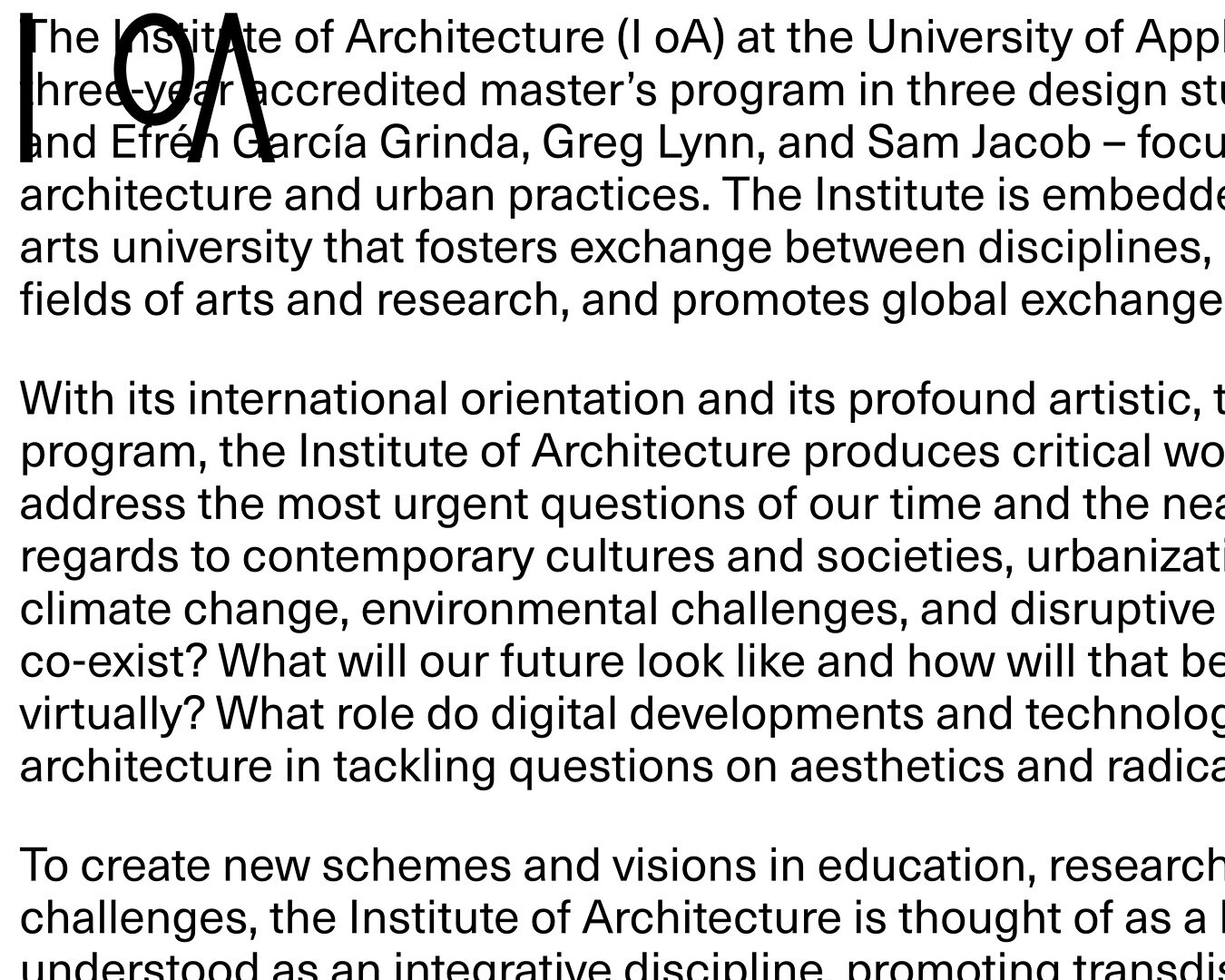 Das Institute of Architecture (IOA) der Angewandten bietet einen dreijährigen Masterstudiengang in drei Designstudios mit dem Schwerpunkt auf progressivem, experimentellem Design in Architektur und urbaner Praxis. Das Institut ist eingebettet in die international renommierte Universität für angewandte Kunst Wien, die den Austausch zwischen Disziplinen fördert, modernste Ausbildung in den Bereichen Kunst, Design und Forschung bietet und den globalen Austausch fördert. Mit seiner internationalen Ausrichtung, seinem fundierten künstlerischen, technischen und diskursiven Bildungsprogramm produziert das IOA kritische Arbeiten und sucht nach visionären Strategien, die die drängendsten Fragen unserer Zeit und der nahen Zukunft thematisieren: die Rolle der Architektur in Bezug auf zeitgenössische Kulturen und Gesellschaften, Urbanisierungsprozesse, Identitätspolitik, Migration, Klimawandel, Umweltherausforderungen und disruptive Technologien?